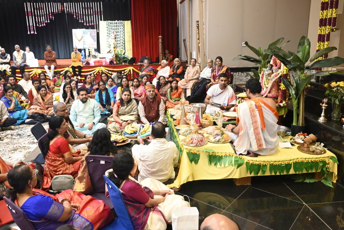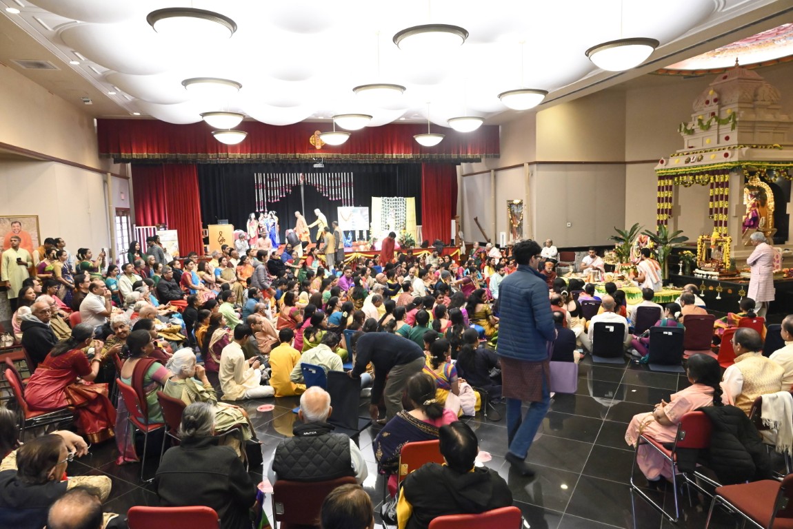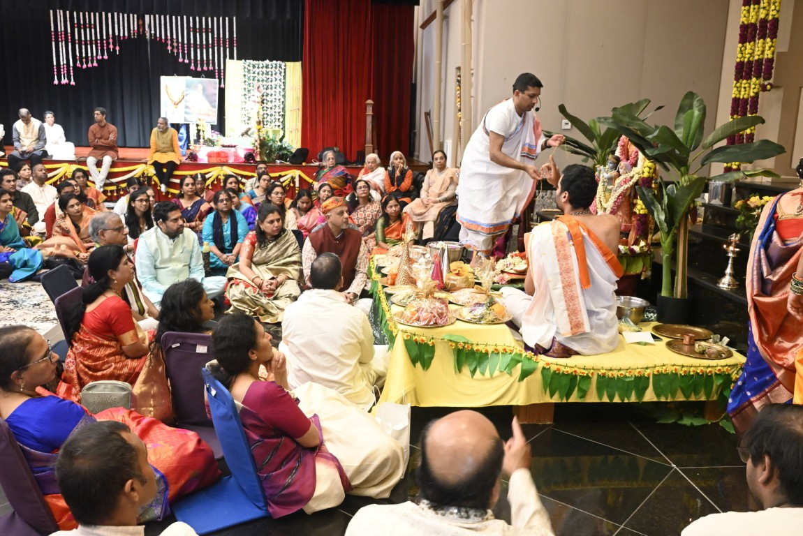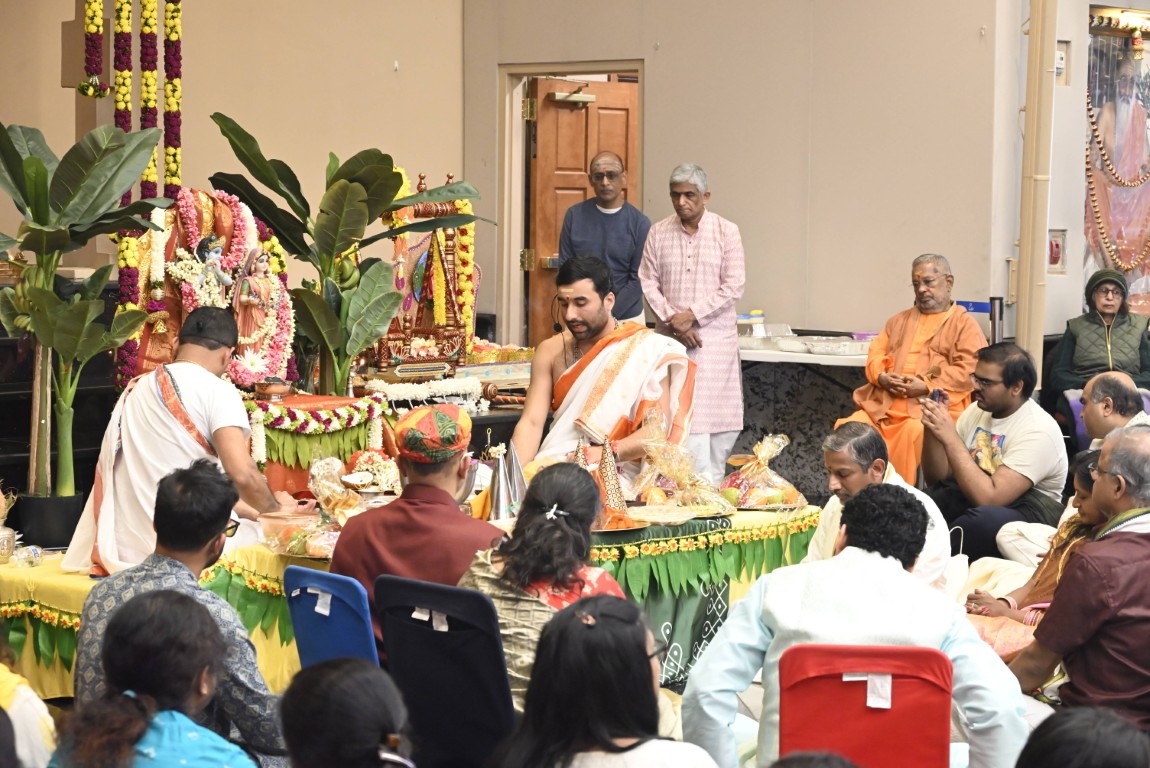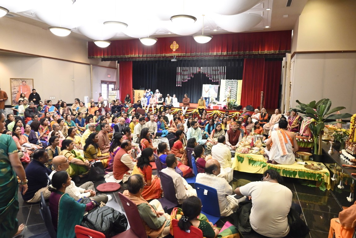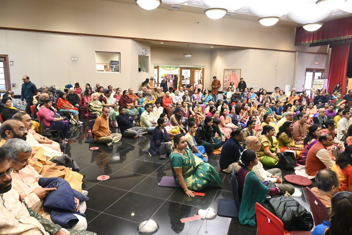 Rukmini Kalyanam conducted at the end of the Srimad Bhagavata Saptaaham by Swami Shantananda ji in Dec 2025. Krishna and Rukmini were brought in a joyous procession by devotees with adults and children dancing to welcome them. Priests then conducted the wedding in a beautiful Vaidika ceremony explaining the rituals to all present. A wedding lunch was served afterwards.