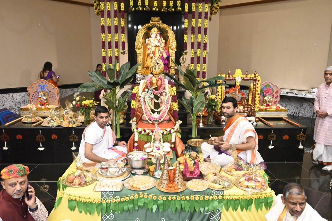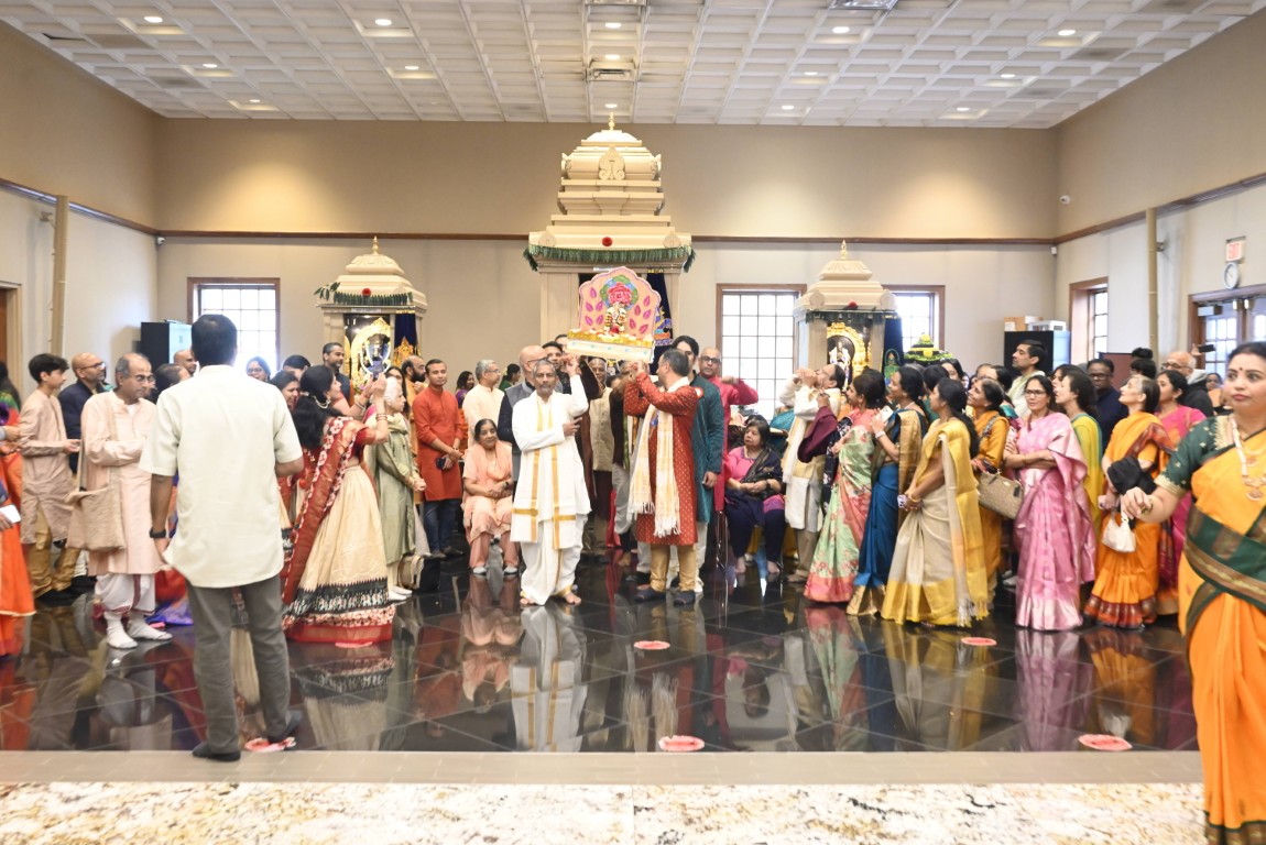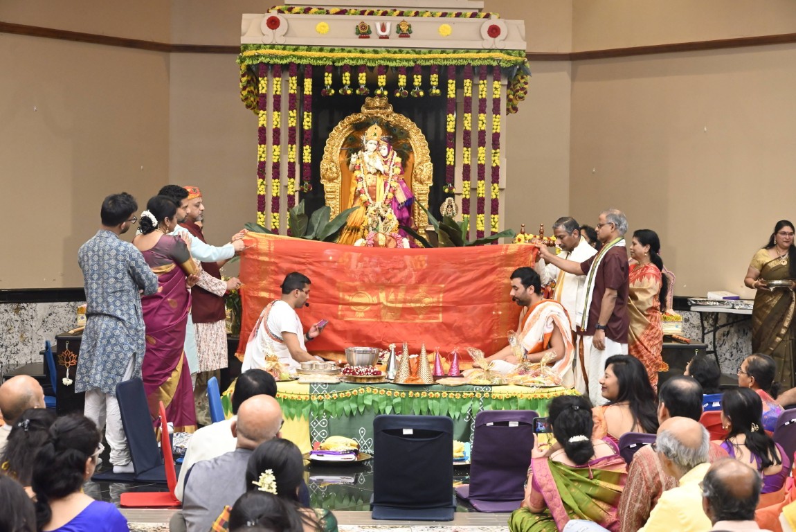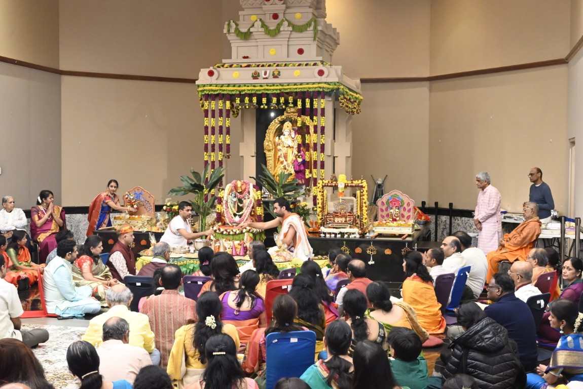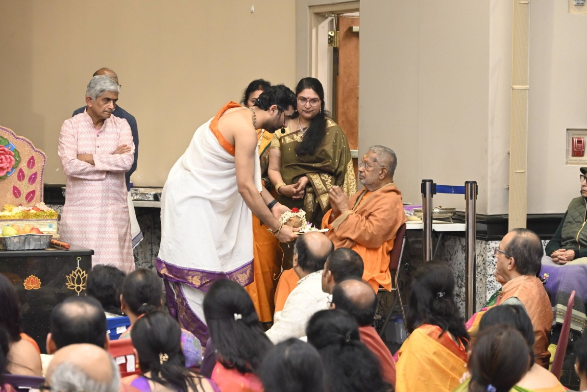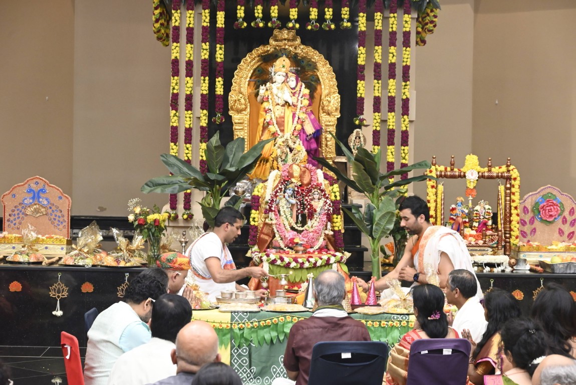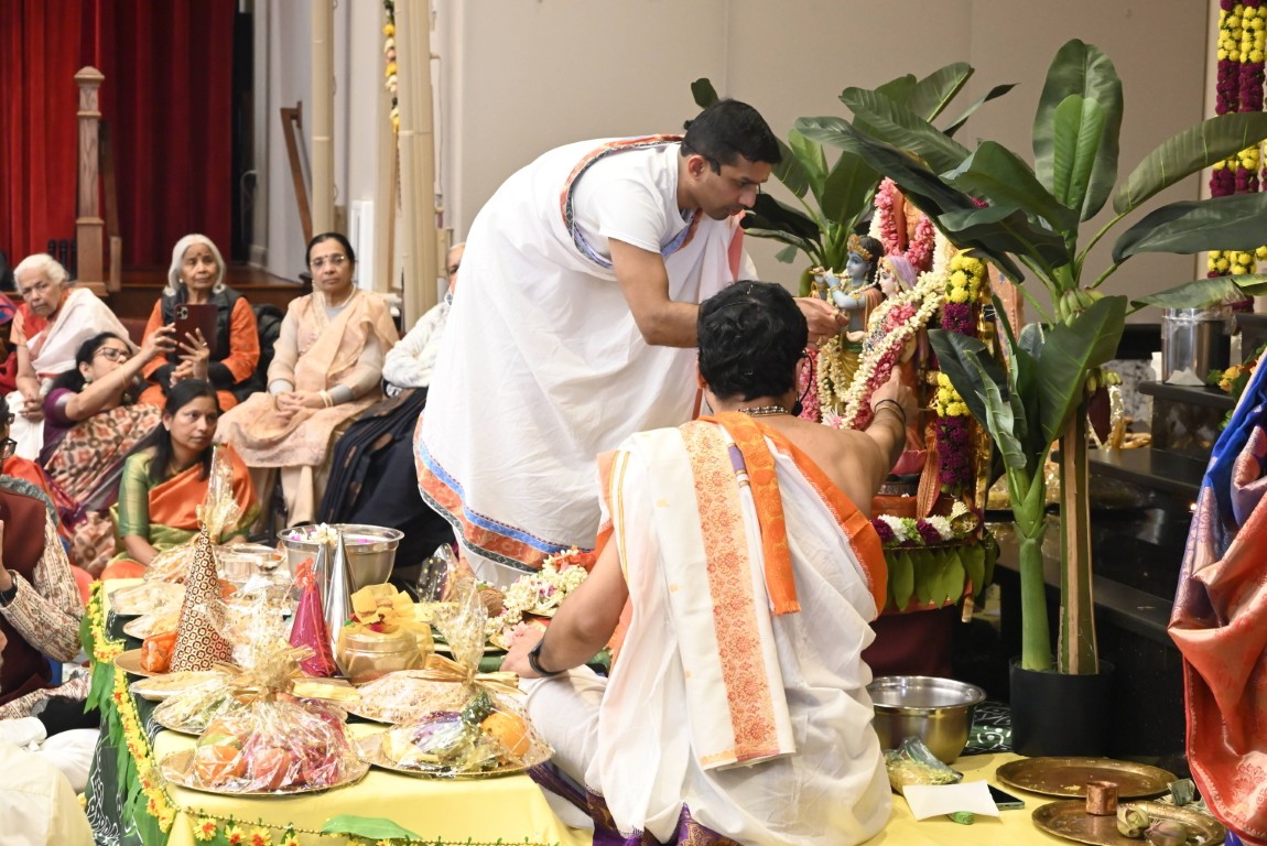 Rukmini Kalyanam conducted at the end of the Srimad Bhagavata Saptaaham by Swami Shantananda ji in Dec 2025. Krishna and Rukmini were brought in a joyous procession by devotees with adults and children dancing to welcome them. Priests then conducted the wedding in a beautiful Vaidika ceremony explaining the rituals to all present. A wedding lunch was served afterwards.