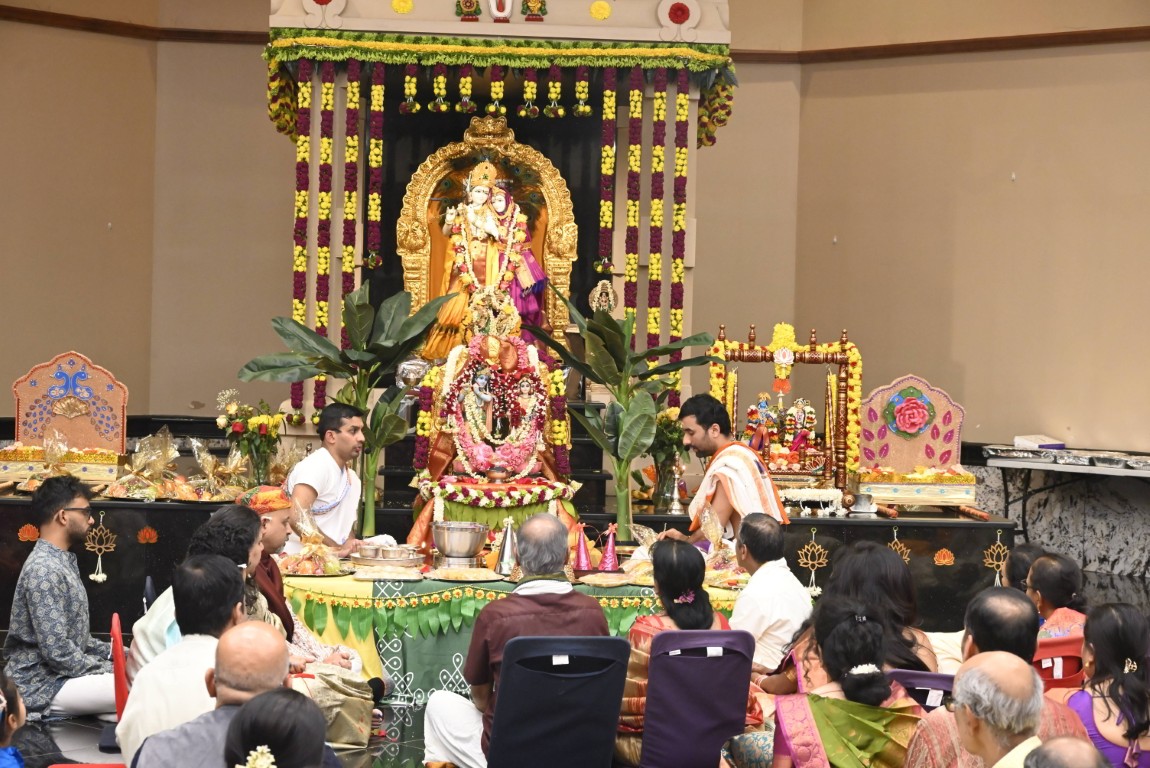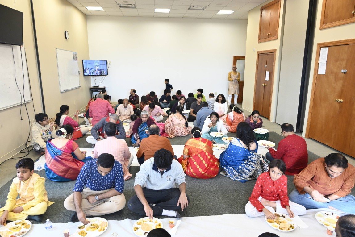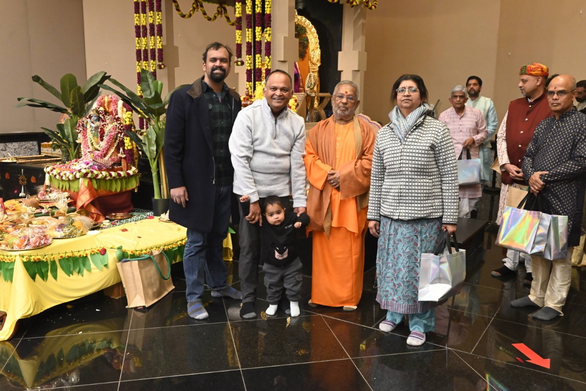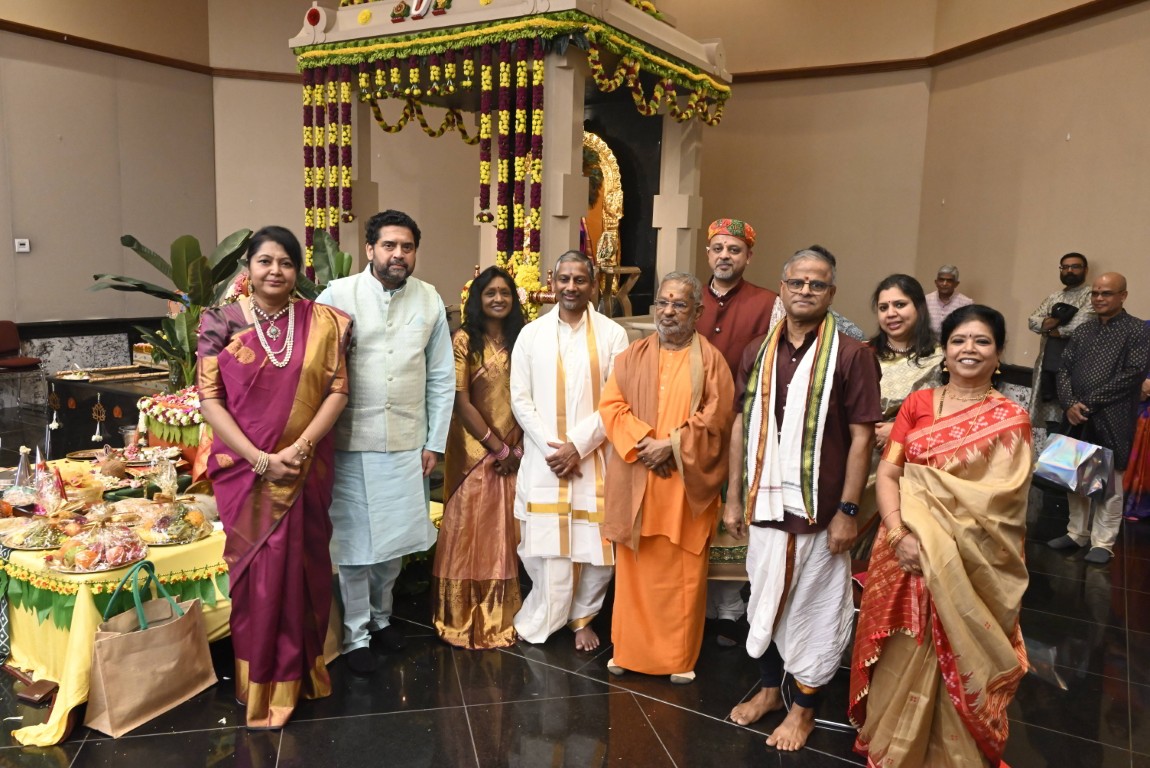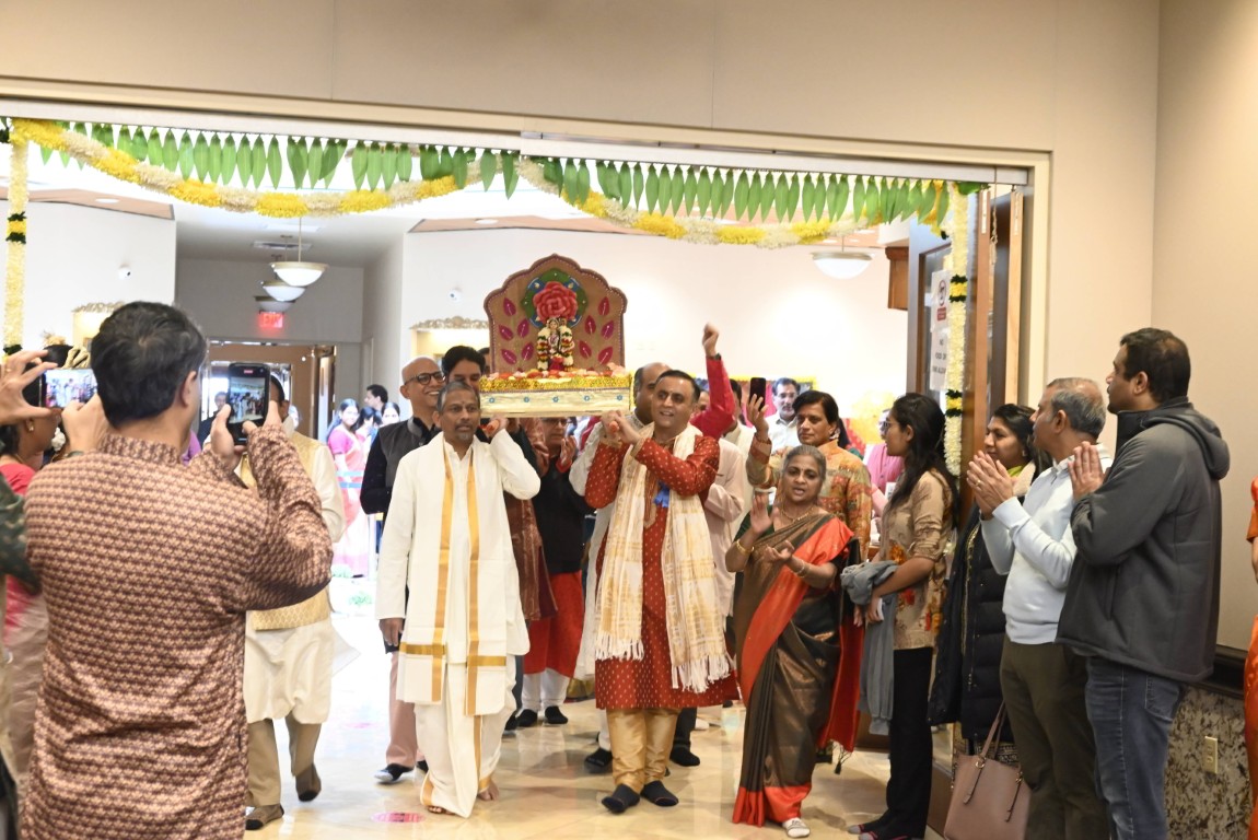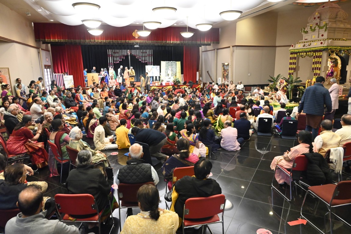 Rukmini Kalyanam conducted at the end of the Srimad Bhagavata Saptaaham by Swami Shantananda ji in Dec 2025. Krishna and Rukmini were brought in a joyous procession by devotees with adults and children dancing to welcome them. Priests then conducted the wedding in a beautiful Vaidika ceremony explaining the rituals to all present. A wedding lunch was served afterwards.