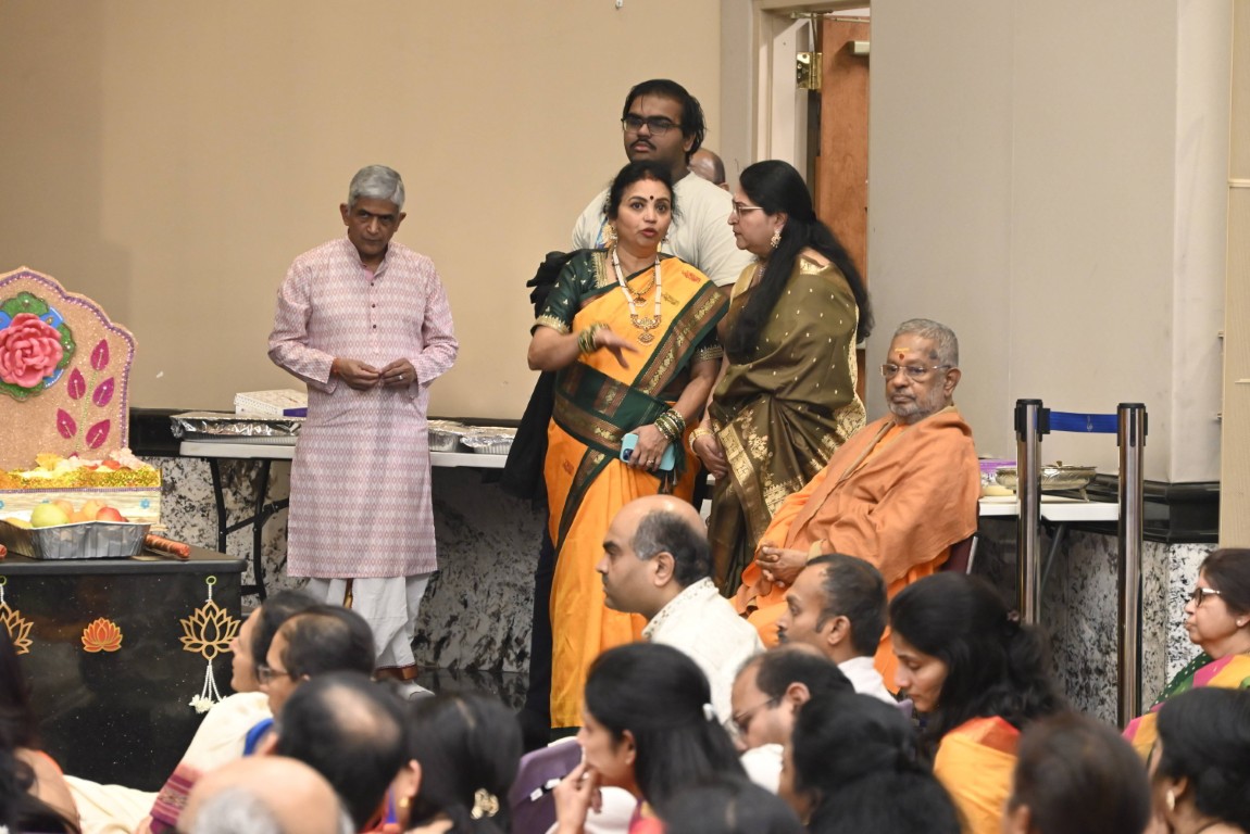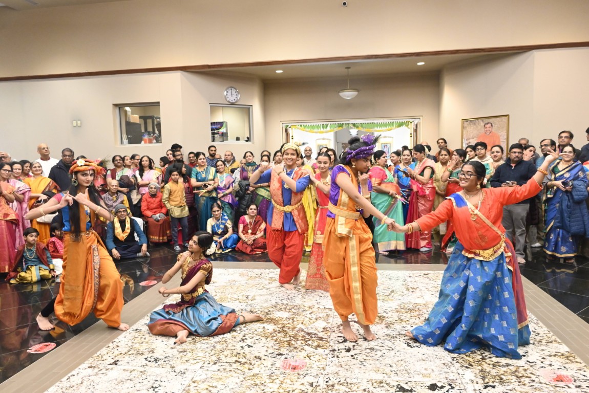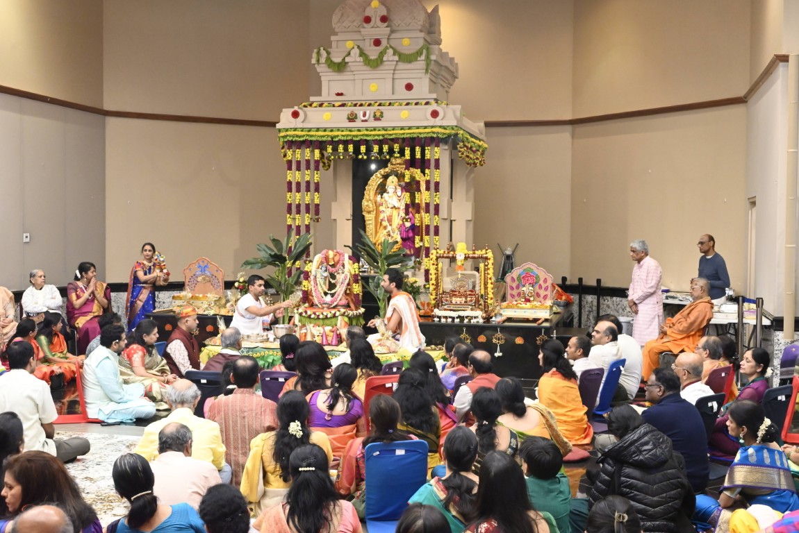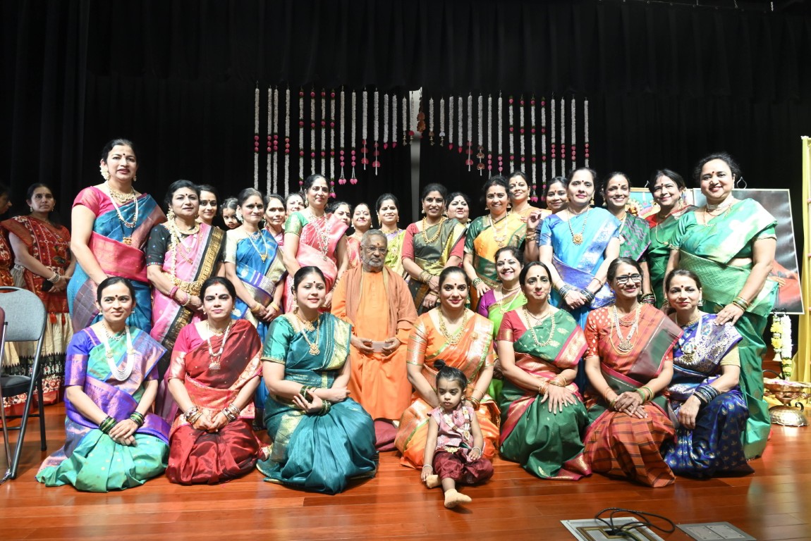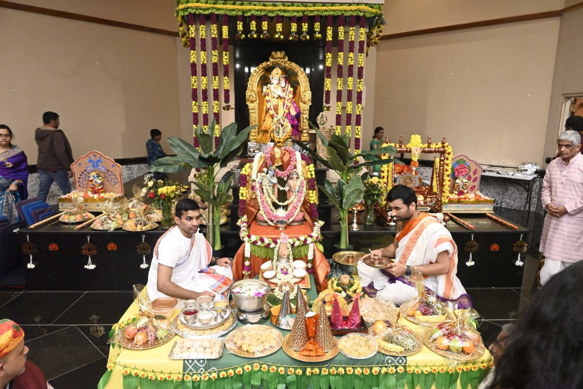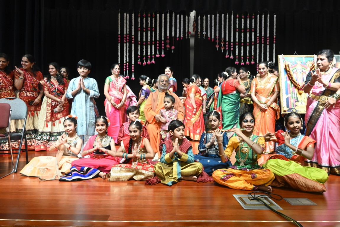 Rukmini Kalyanam conducted at the end of the Srimad Bhagavata Saptaaham by Swami Shantananda ji in Dec 2025. Krishna and Rukmini were brought in a joyous procession by devotees with adults and children dancing to welcome them. Priests then conducted the wedding in a beautiful Vaidika ceremony explaining the rituals to all present. A wedding lunch was served afterwards.