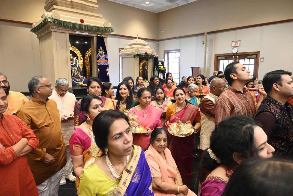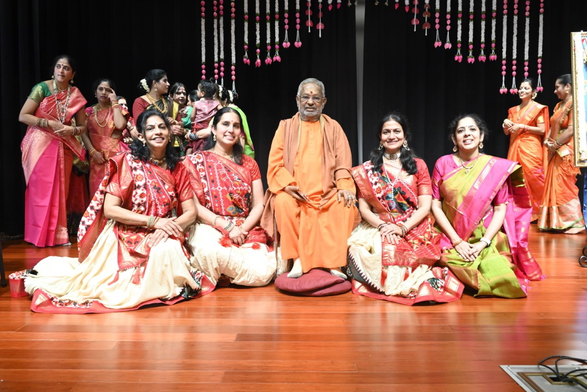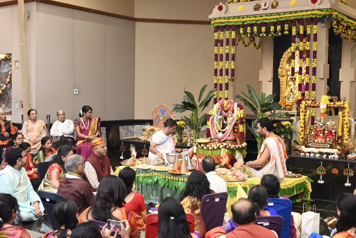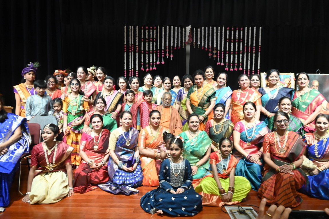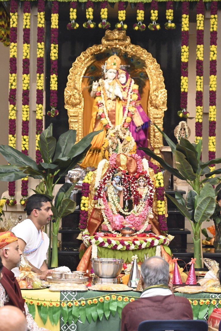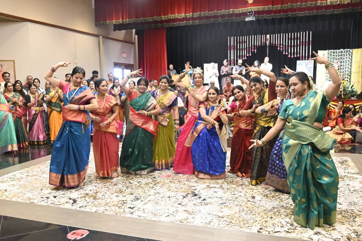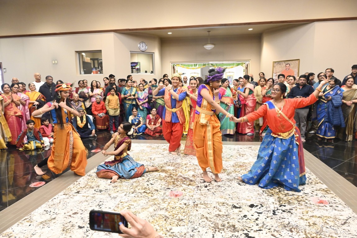 Rukmini Kalyanam conducted at the end of the Srimad Bhagavata Saptaaham by Swami Shantananda ji in Dec 2025. Krishna and Rukmini were brought in a joyous procession by devotees with adults and children dancing to welcome them. Priests then conducted the wedding in a beautiful Vaidika ceremony explaining the rituals to all present. A wedding lunch was served afterwards.