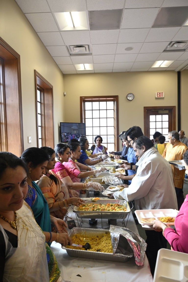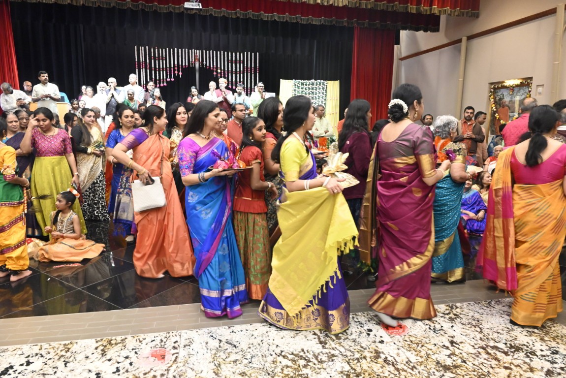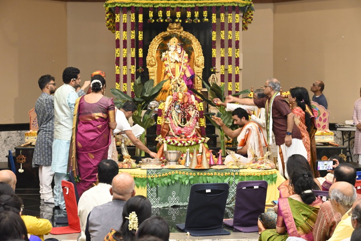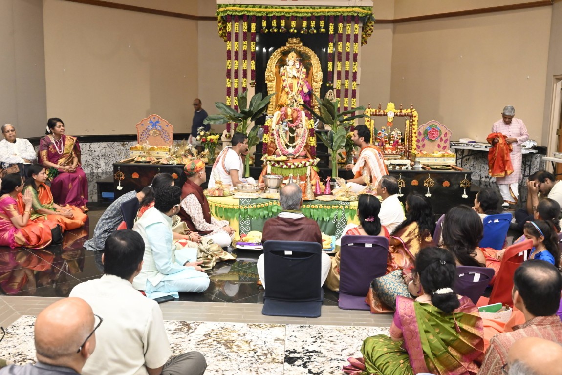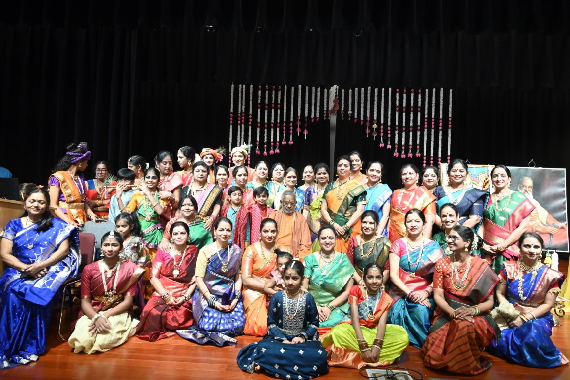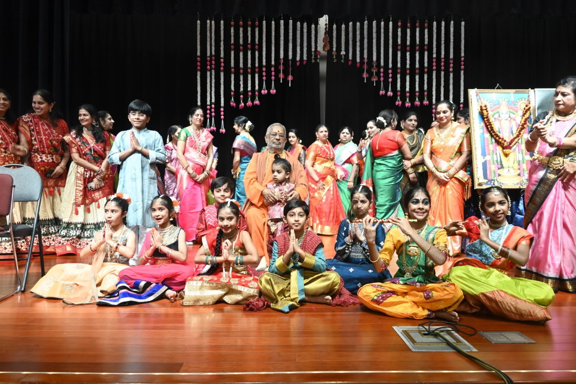 Rukmini Kalyanam conducted at the end of the Srimad Bhagavata Saptaaham by Swami Shantananda ji in Dec 2025. Krishna and Rukmini were brought in a joyous procession by devotees with adults and children dancing to welcome them. Priests then conducted the wedding in a beautiful Vaidika ceremony explaining the rituals to all present. A wedding lunch was served afterwards.