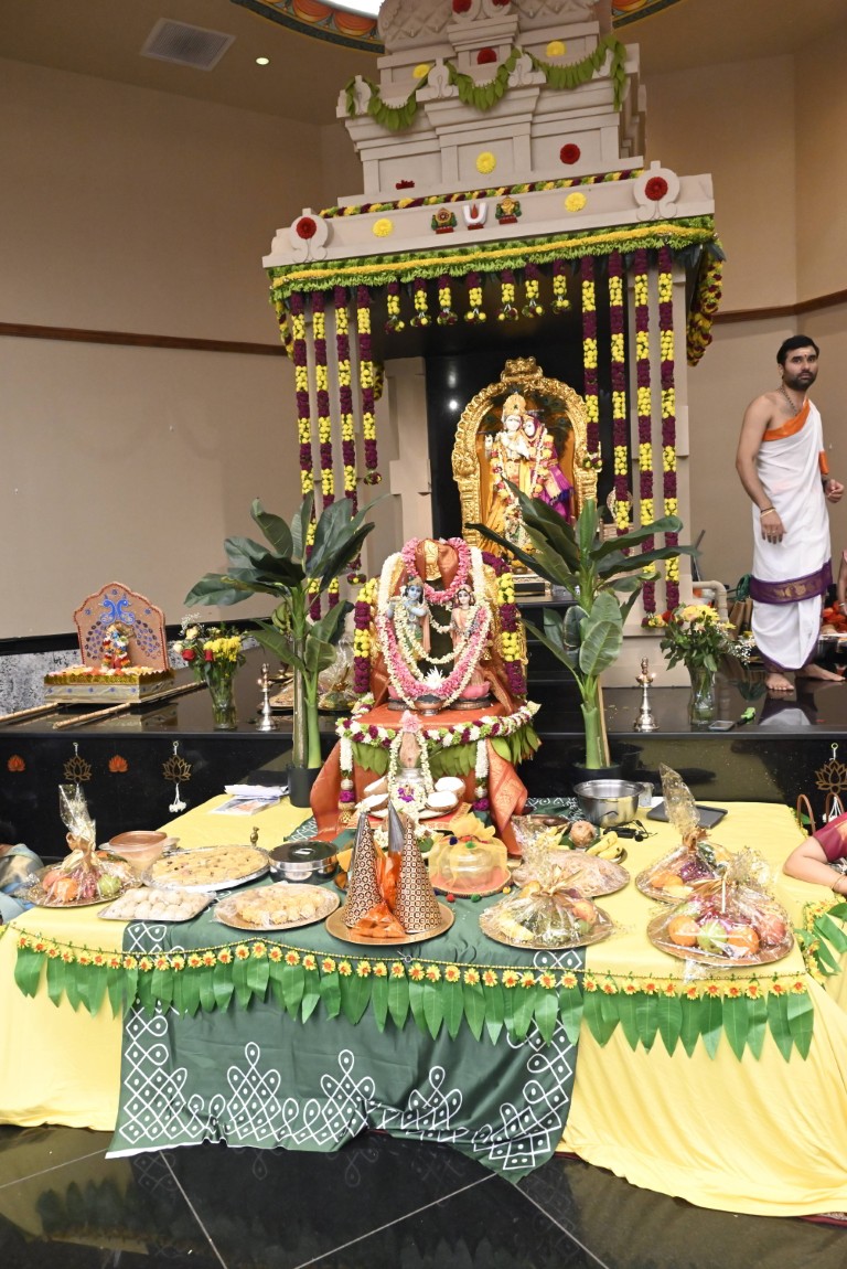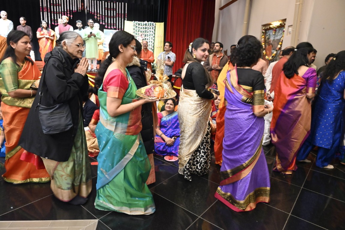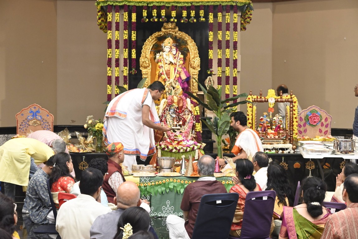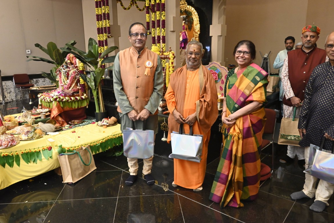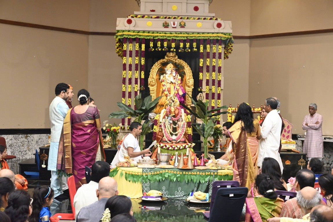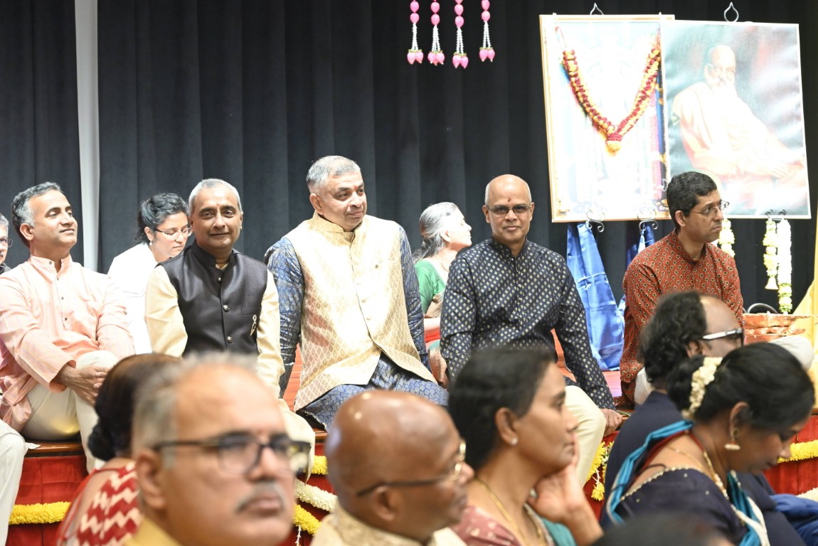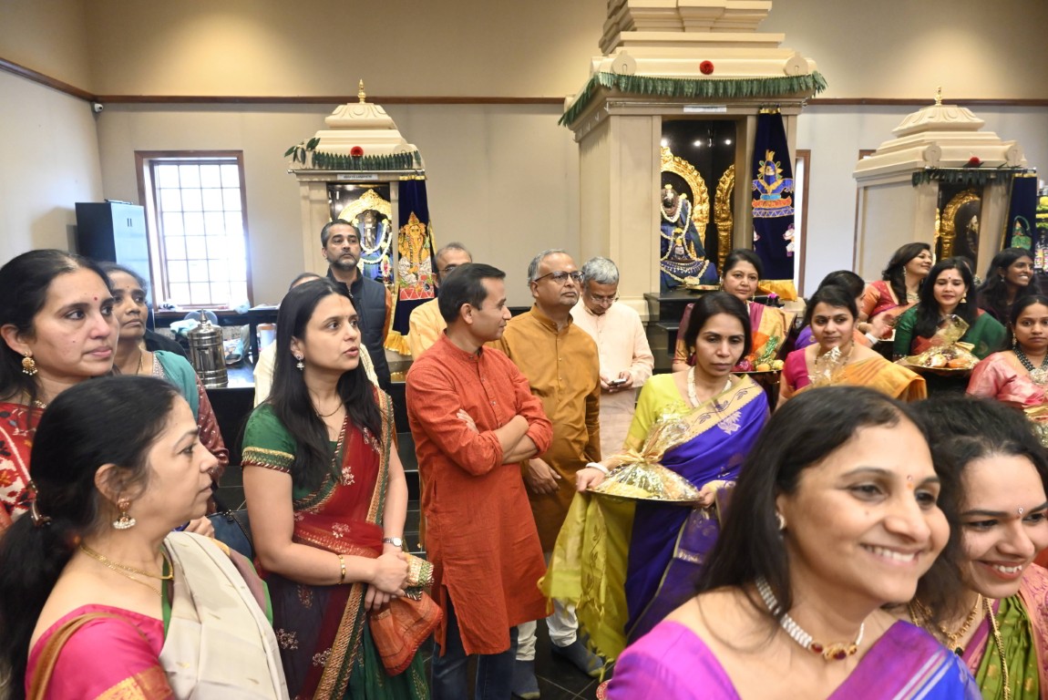 Rukmini Kalyanam conducted at the end of the Srimad Bhagavata Saptaaham by Swami Shantananda ji in Dec 2025. Krishna and Rukmini were brought in a joyous procession by devotees with adults and children dancing to welcome them. Priests then conducted the wedding in a beautiful Vaidika ceremony explaining the rituals to all present. A wedding lunch was served afterwards.