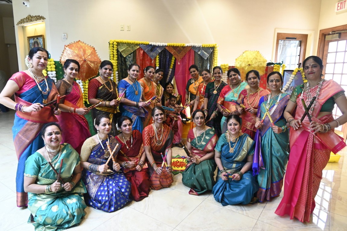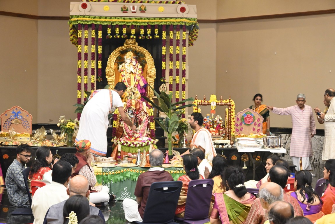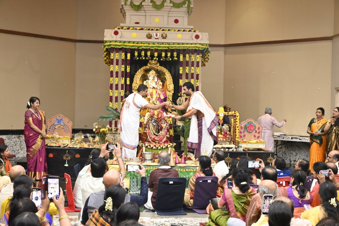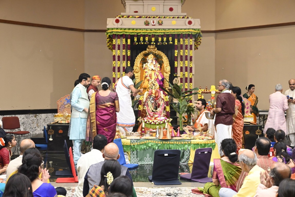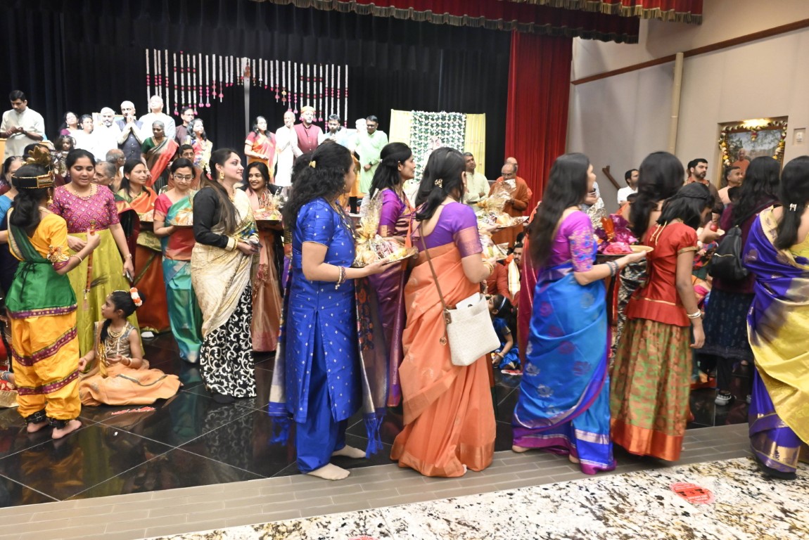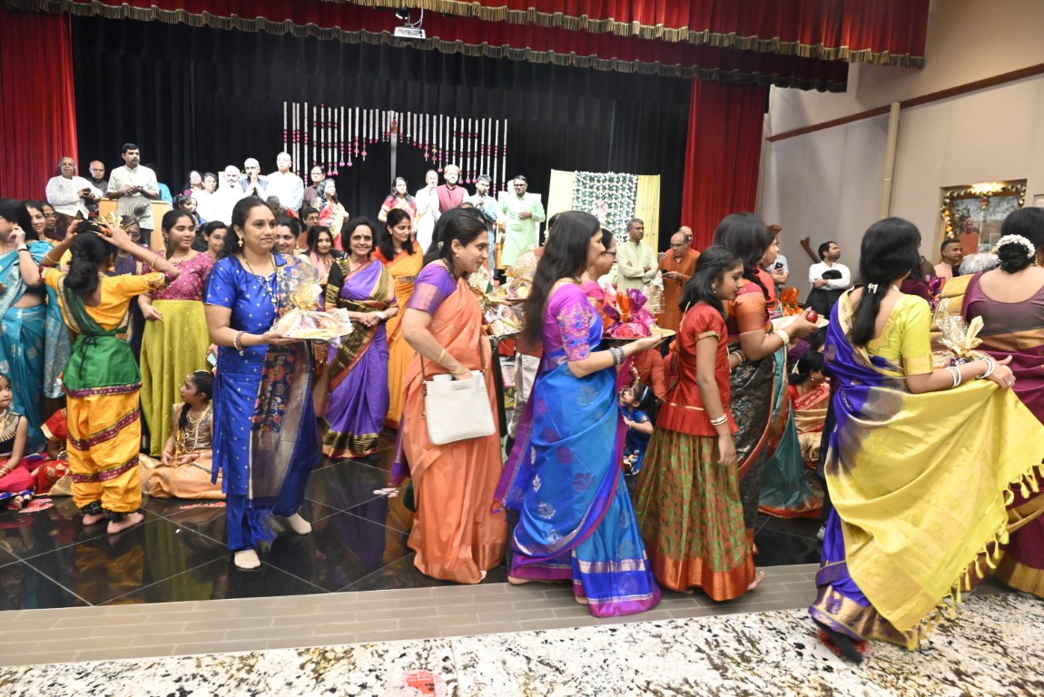 Rukmini Kalyanam conducted at the end of the Srimad Bhagavata Saptaaham by Swami Shantananda ji in Dec 2025. Krishna and Rukmini were brought in a joyous procession by devotees with adults and children dancing to welcome them. Priests then conducted the wedding in a beautiful Vaidika ceremony explaining the rituals to all present. A wedding lunch was served afterwards.